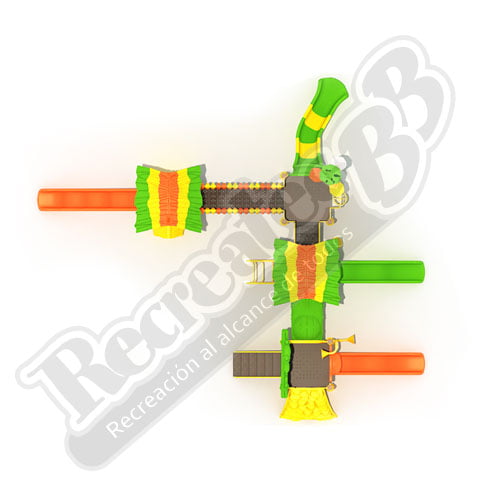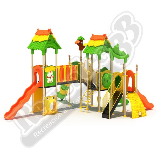 Este módulo es la solución perfecta para parques públicos de gran escala o centros educativos que buscan un equipo central que promueva el ejercicio físico intenso, la agilidad y la interacción social en un entorno temático que simula la naturaleza y el mundo verde.